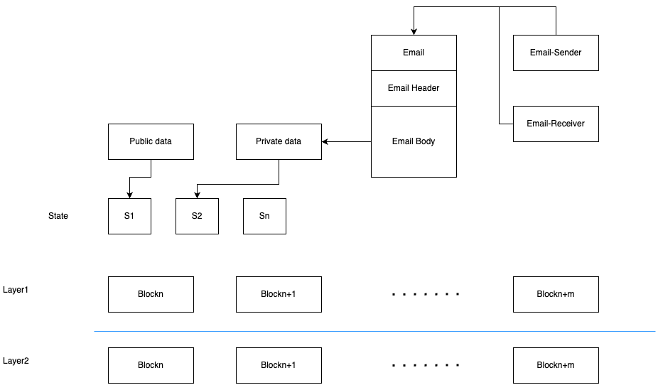 区块链的二层扩展功能在一定程度上可以在邮件中实现,而且会具有一些新特性。这种设计相对于EIP-4844中的Blob方案会更有特点。对于只需要交易双方知道的交易数据,可以在电子邮件中实现,不仅交易双方可以随时验证数据的正确性,对于外界还可以隐藏掉一些隐私数据。我们通过了解当前的二层扩展原理图,可以构思在邮件中的二层原理图。