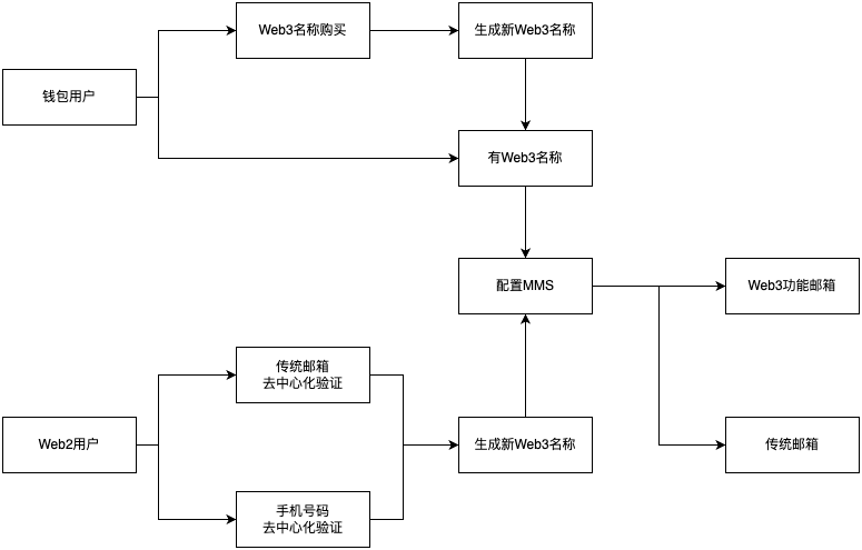 在MMS关系图中,Web3名称服务商收取自己的服务费用,例如ENS对于域名的收费规则,这样Web3名称服务商可以按年收取费用。虽然传统用户可以通过传统邮箱和手机号码产生新的Web3名称,因为传统邮箱和手机号码的拥有权在中心化机构手中,不能收取费用,或只能收取较少的费用。MMS的配置服务,可以收取一定的费用,当前我们的定价是0.5美元/年。用户可以选择使用具有全新功能的Web3邮箱,也可以选择使用其他的传统邮箱。全新Web3功能邮箱具有比传统邮箱更丰富的功能,需要单独付费,这是我们一直在开发的底层邮件系统,未来会考虑完全开源。其它功能的邮箱不具有全部的Web3功能,可以通过我们的邮件客户端支持部分Web3功能,未来邮件客户端也会考虑完全开源。