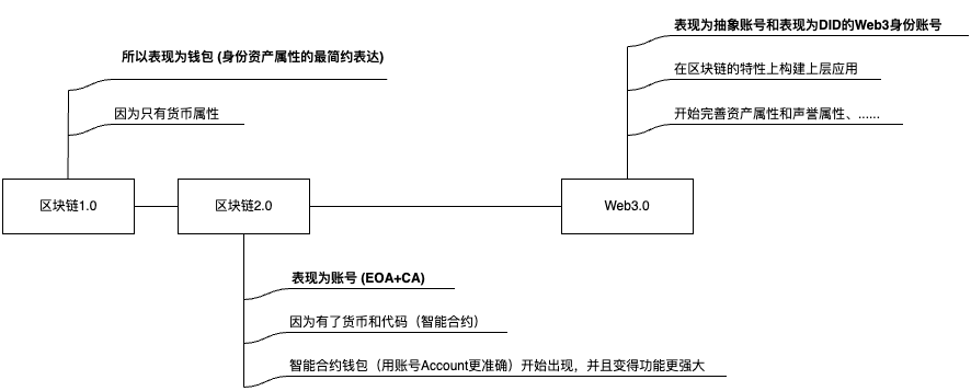 从区块链技术的发展历史,我们可以看到从钱包地址→账号→身份的发展变化过程以及相关的外部原因,如下图所示: