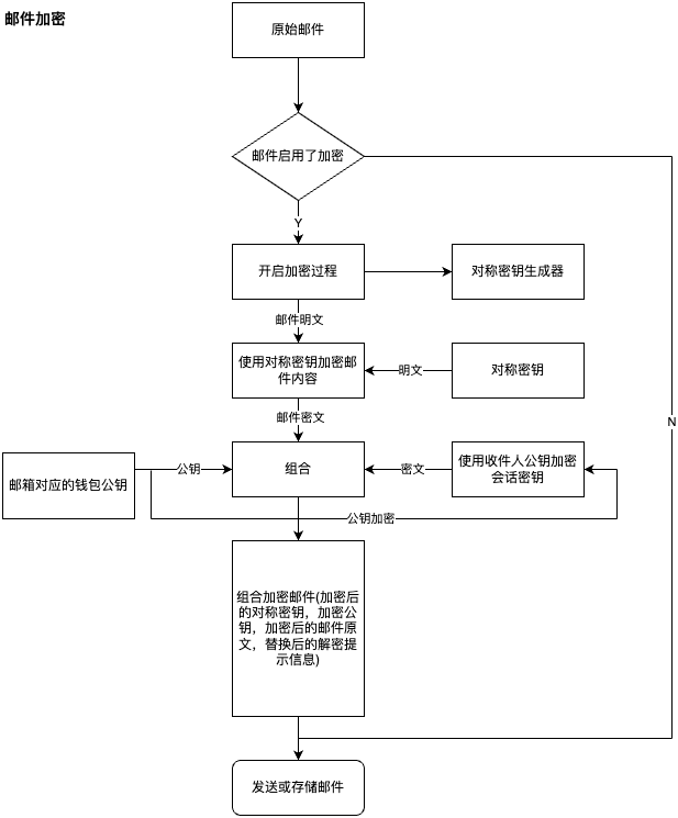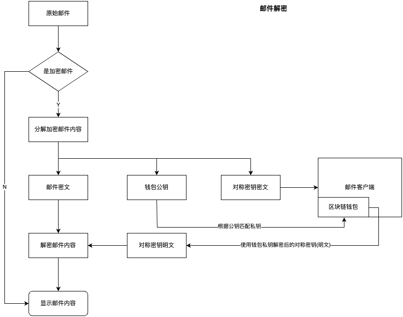 在使用区块链钱包中的公私钥进行邮件信息的加解密,通常需要使用混合加密算法,使用对称密钥对邮件内容进行加密,使用接收人的公钥加密对称密钥;解密过程相反,使用私钥解密对称密钥,再使用对称密钥解密邮件内容。使用区块链技术的邮件加解密示意图。